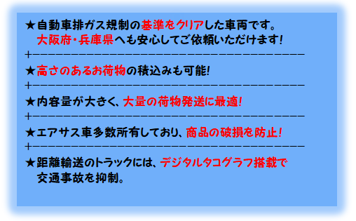 また、弊社の車両は自動車排出ガス規制(自動車の内燃機関から排出される一酸化炭素・窒素酸化物・炭化水素類・黒煙等の大気汚染物質の上限を定めた規制)の基準をクリアした車両です。そのため、大阪府・兵庫県への輸送も安心してご依頼いただけます。