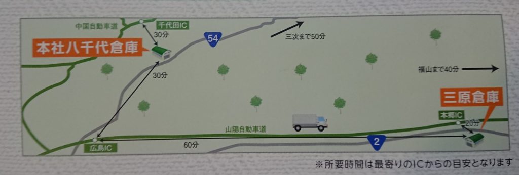 国道2号線沿いに位置し、山陽道、本郷1C 20分広島空港30分.広島IC60分.岡山IC90分、東西南北への配送に適した場所です。10棟、延べ2,600坪の広さと高さのある倉庫で、お客様のご要望にお応えできるサービスと環境が整っております。